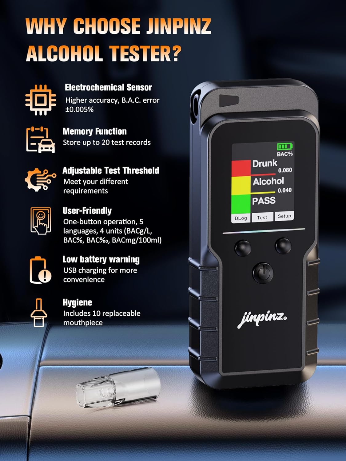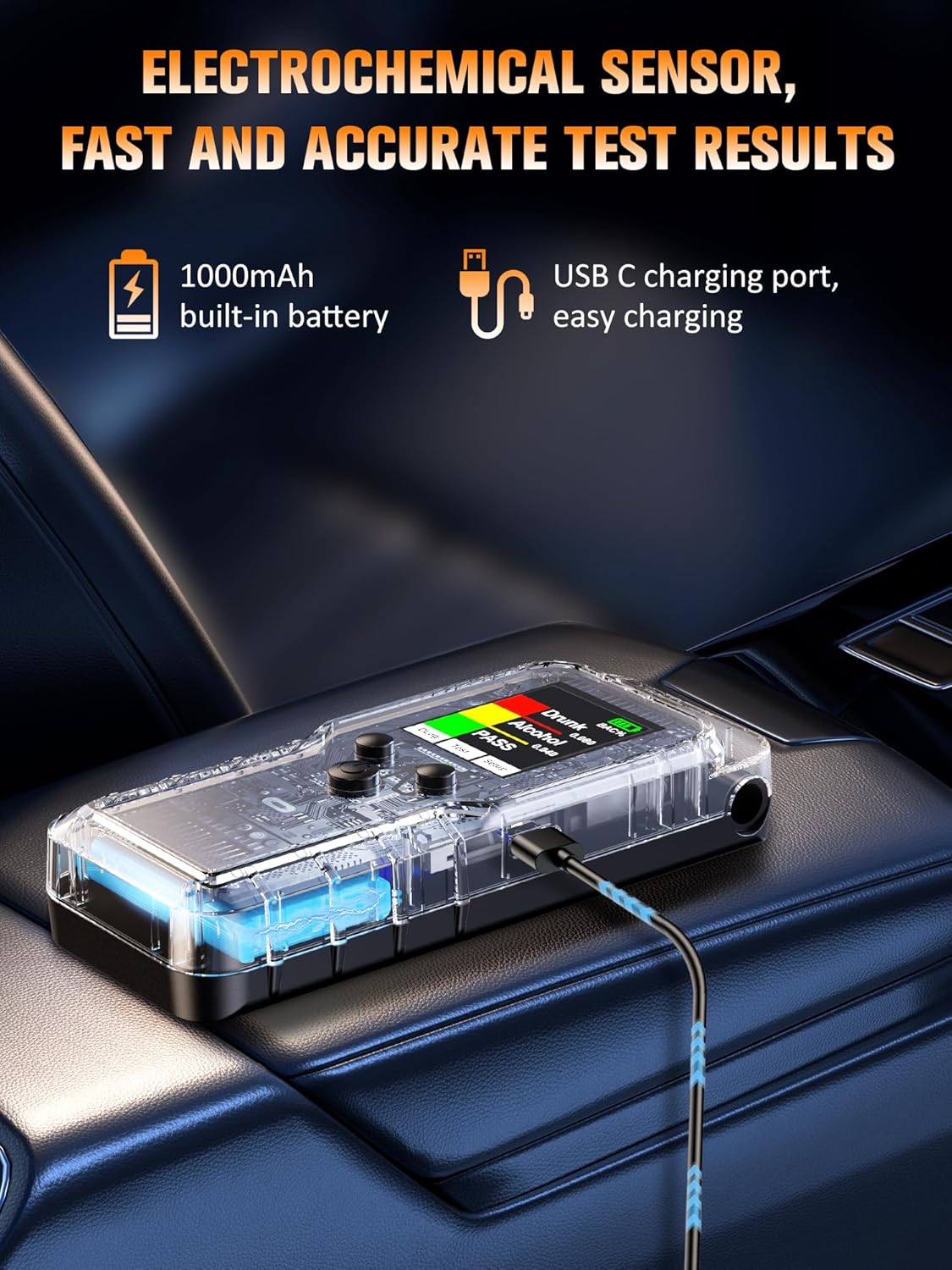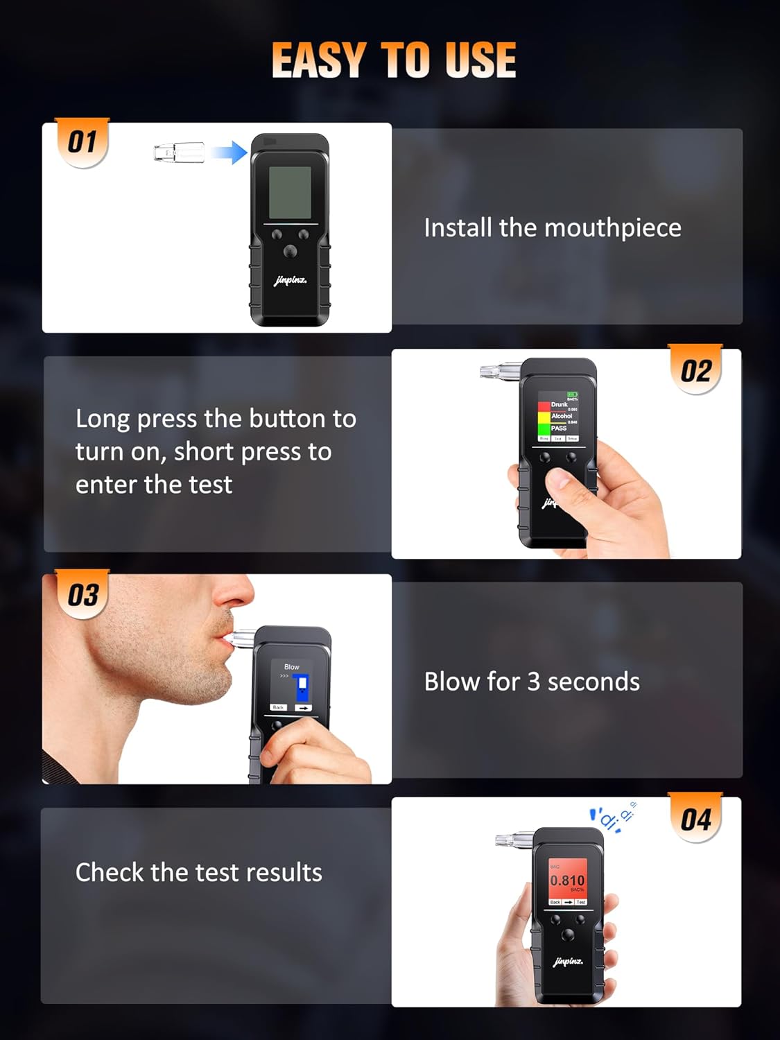 Product description:Accurate & Fast BAC Readings: Professional-grade breathalyser uses a high-precision electrochemical sensor with a margin of error less than 0.005%. It provides reliable results in just 3 seconds, clearly shown on a bright, easy-to-read LCD screen. Alcohol Breathalyzer ideal for quick self-assessment after social occasions.