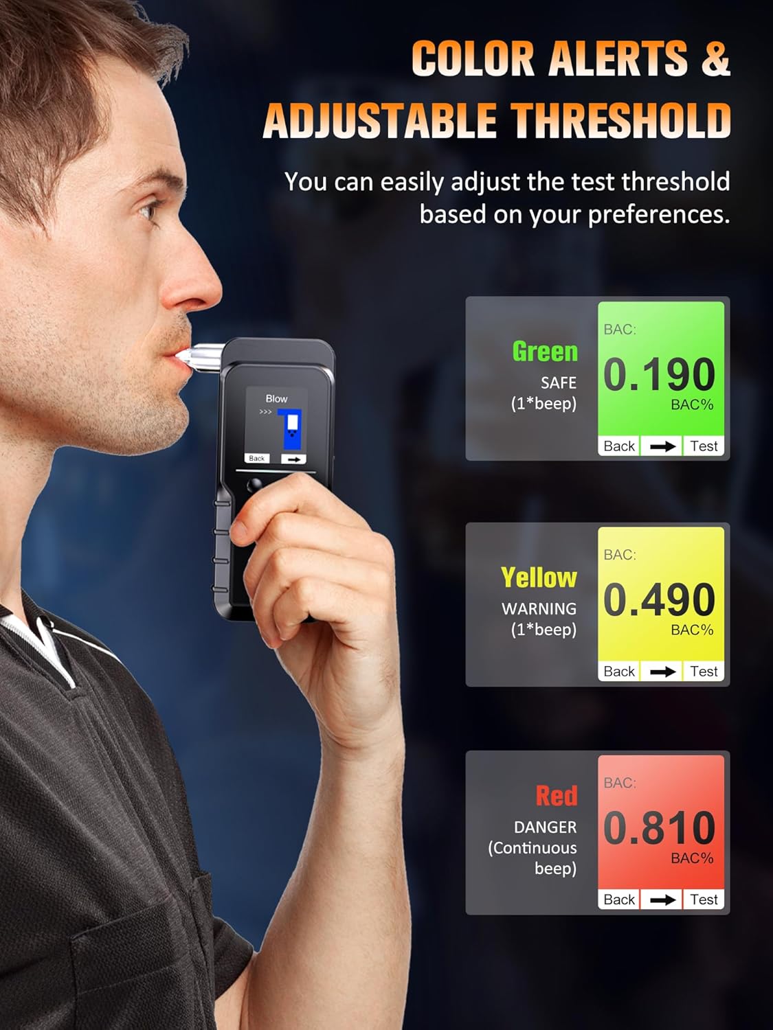 Custom Warning Thresholds & Colour Display: Set a personalised limit on your Alcohol Breath Test device to receive alerts whenever your BAC reading exceeds your chosen level. This breathalyzer with LCD display features clear, colour-coded visuals and audio warnings, making it easy to interpret your results at a glance for enhanced safety and peace of mind.