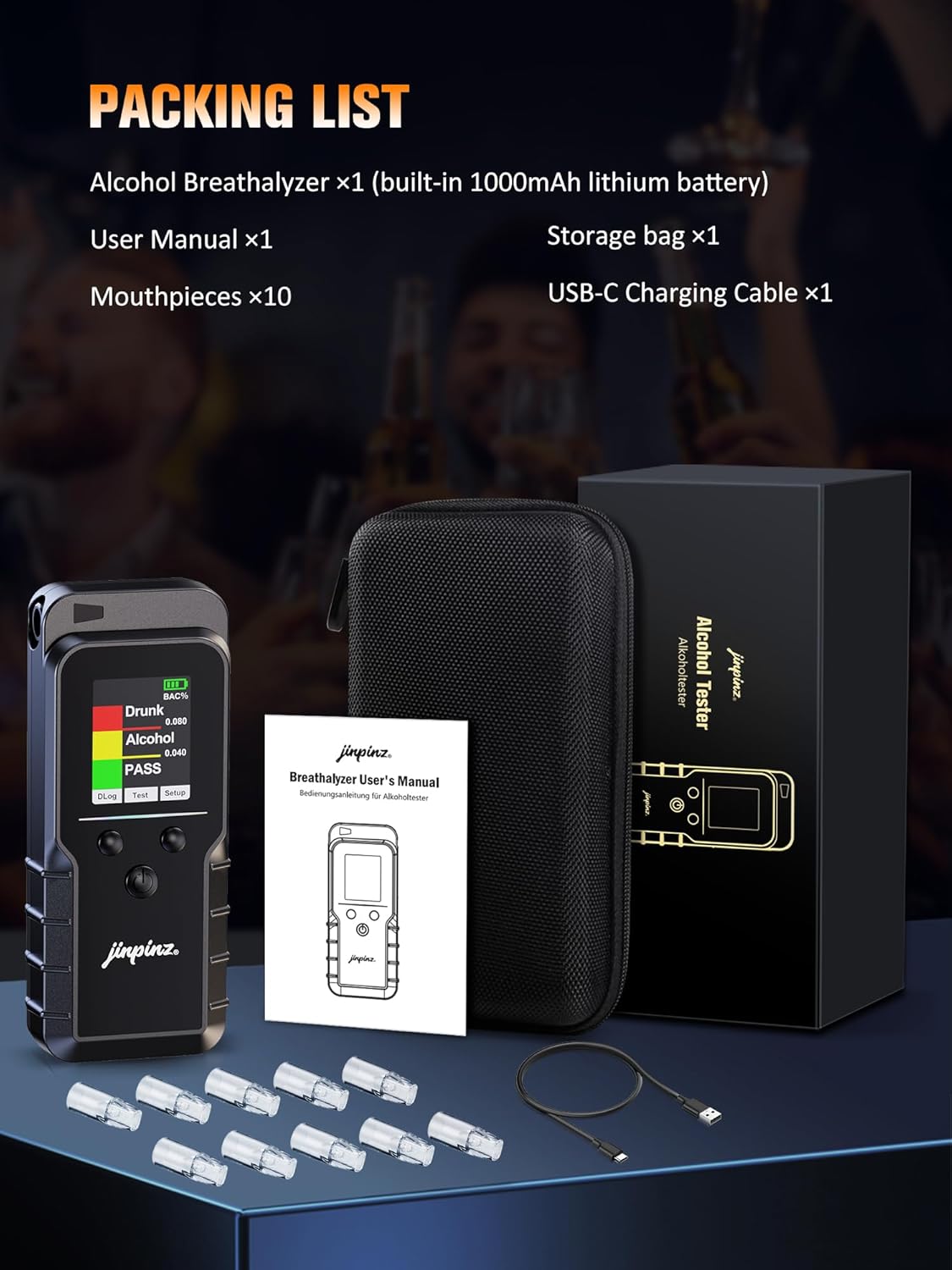 Highly Sensitive & Durable Breathalyzer with Electrochemical SensorPowered by a professional fuel cell sensor, this device guarantees precise and consistent readings. It’s designed for both professional environments and private use, giving you trustworthy results every time. | Track Your Progress with Built-in MemoryKeep an eye on your alcohol levels over time with the breathalyser’s memory feature, which stores your last 20 test results. professional breathalyzers ideal for regular monitoring and making informed choices about your health and safety. | Product SpecificationsSize: 12 × 5.7 × 2.7 cm Weight: 145 g Its compact and lightweight design makes it easy to carry in your pocket or bag—ideal for travel, social events, or everyday use. | What’s Included1× Personal Breathalyser with built-in rechargeable battery 10× Reusable Mouthpieces for hygienic testing 1× USB-C Charging Cable 1× Protective Storage Case 1× Comprehensive User Manual |